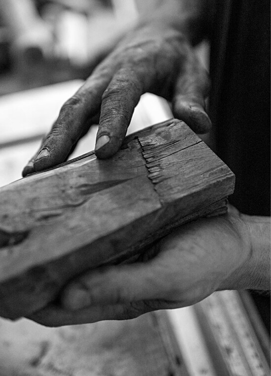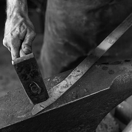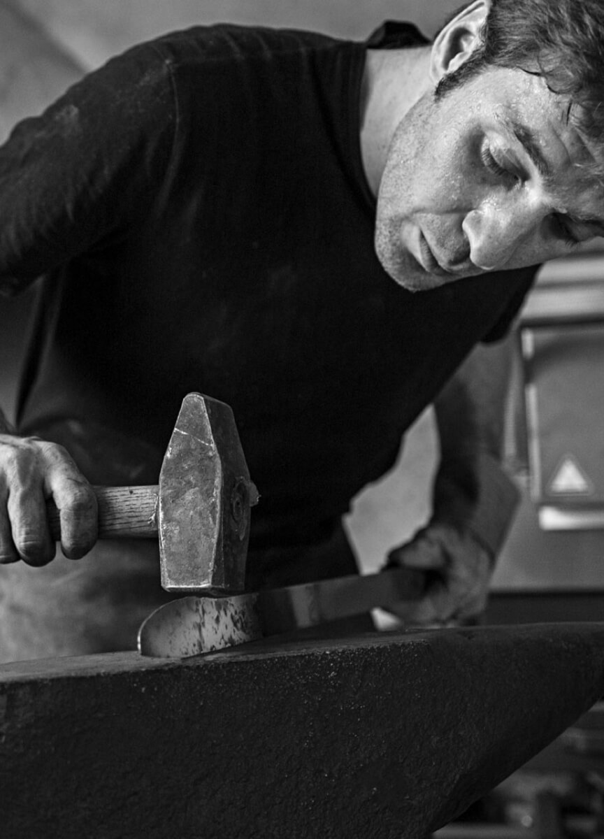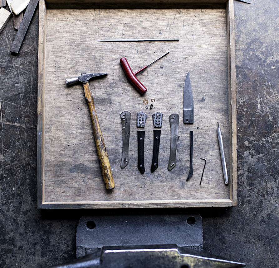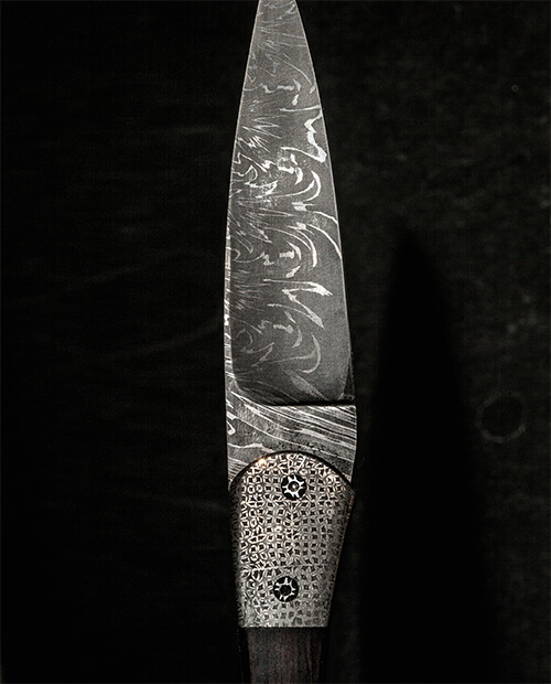 The technique to make this material is based on the stacking of steels with different hardnesses: the block that is obtained is stretched, sometimes twisted, folded upon itself… These operations are repeated until several hundreds of layers are obtained. Acid treatment will then reveal more or less geometric lines and motifs.