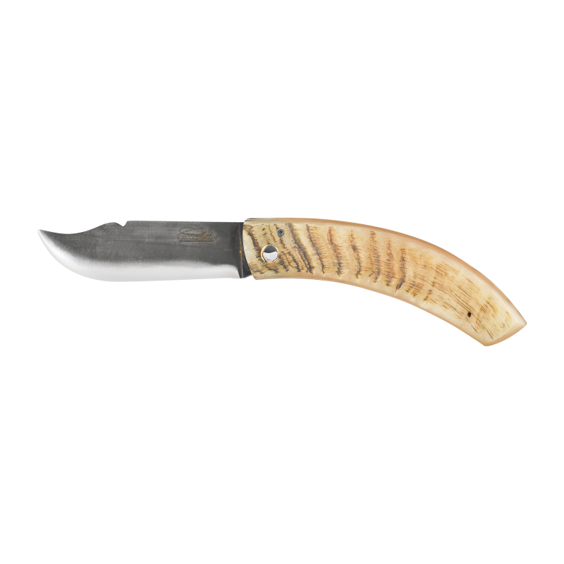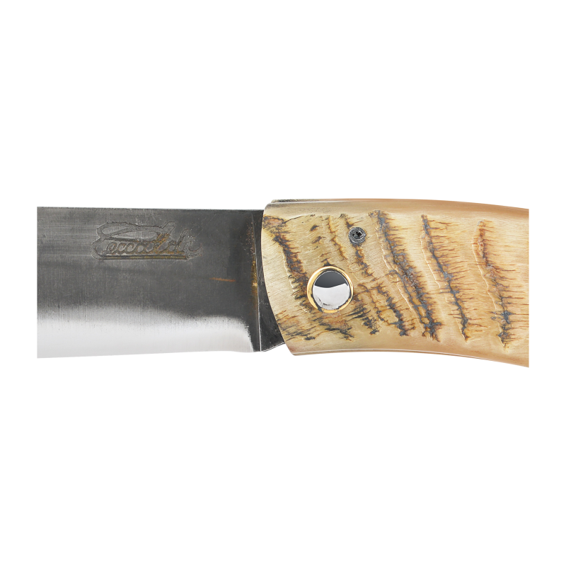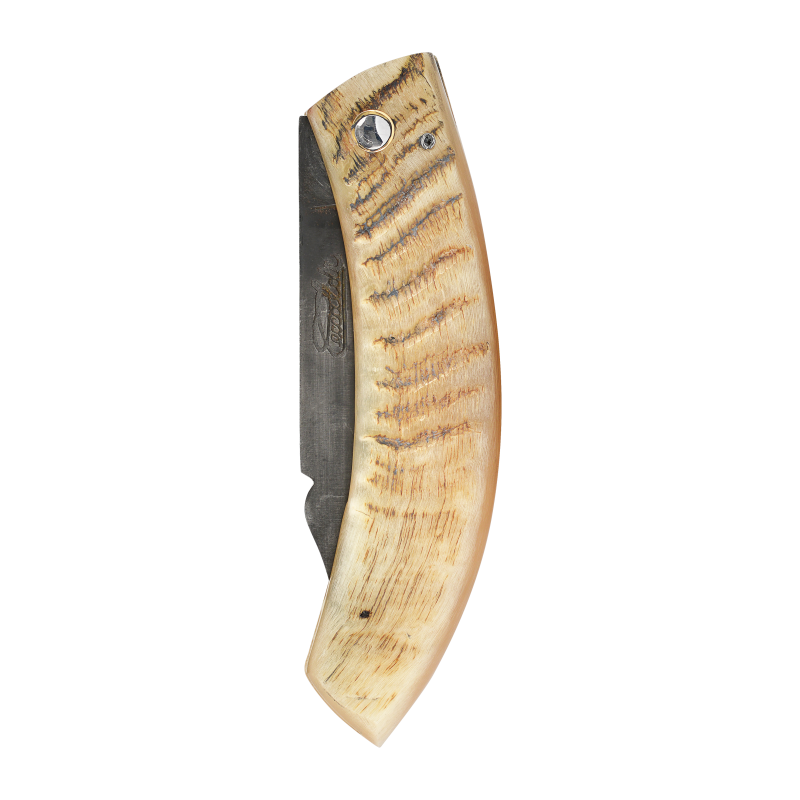 Coming from the Corsican agro-pastoral tradition, the shepherd knife is intended for daily use, its blade in damask steel allows an easy sharpening and guaranteed a traditional appearance for this knife with an assertive character. The curved shape comes directly from the tip of the horn in which the handle is cut. The particular shape of this blade is linked to the use by the Corsican shepherds of this knife as a daily tool, serving as well to cut the charcuterie as to carve wood or even to peel the wicker. The closing mechanism is simple, an axis and a stop, on which the cutlery Ceccaldi holds a patent allowing the blade to be held in open position, this is not a notch strictly speaking but it allows to secure a little more this knife