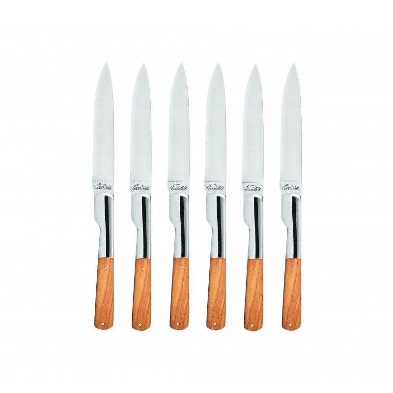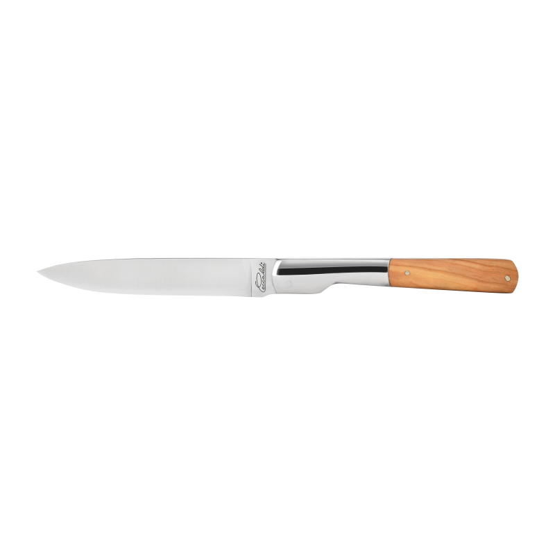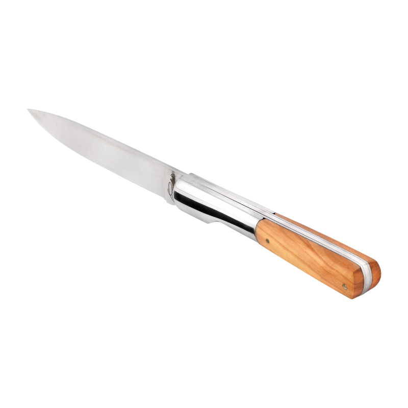 The olive wood that the Ceccaldi company uses is dry and healthy. It has a fair, moderately intense colour, with brown veins. It will form a patina over time. To maintain olive wood, it is crucial not to plunge the handle into water. It is also necessary to oil the handle, once or twice a year, with camellia or olive oil for instance.