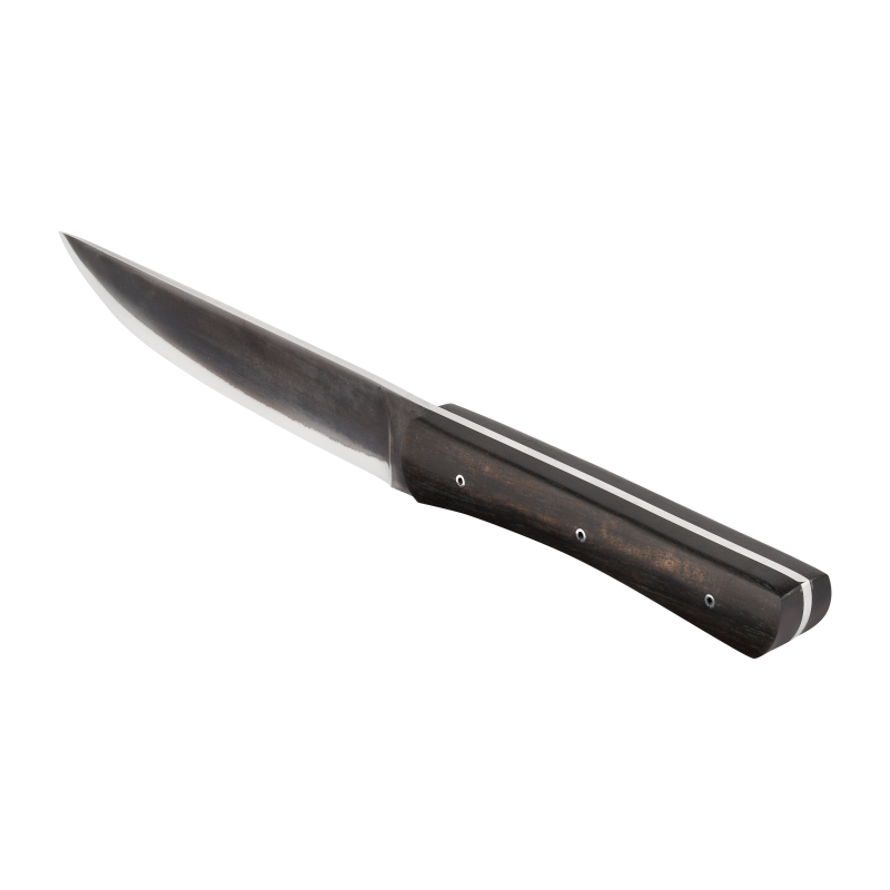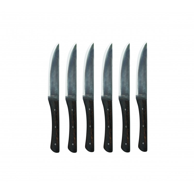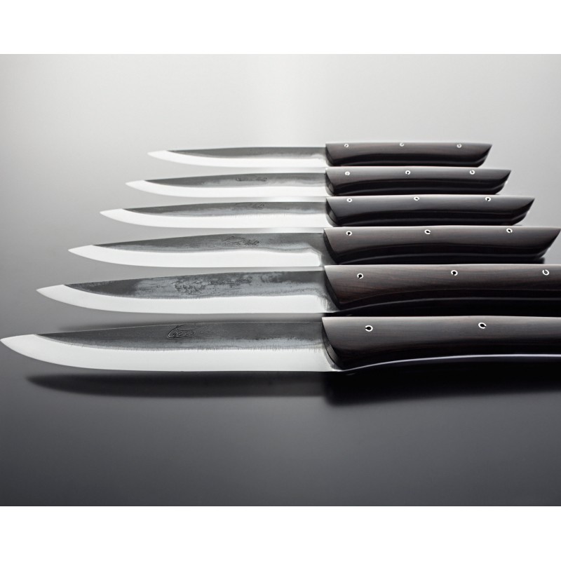 The Terra model of the Ceccaldi cutlery, is a table knife with the traditional appearance, the dark part of the blade results from the hardening operation of the blade and has been kept in order to give this knife its special character. Fixed by pins, the handles are made of horn or wood, its blade is made of stainless steel. These knives are sold in boxes of 6 pieces