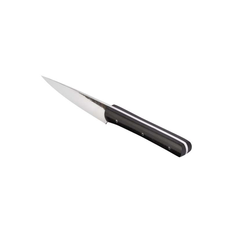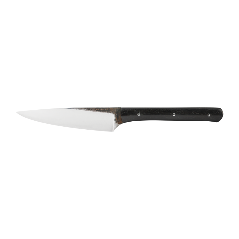 Couteau de cuisine acier carbone, longueur totale 18 centimètres, dimensions idéales pour tous les petits travaux de cuisine.  Les couteaux de cuisine sont en acier carbone, celui-ci va, avec le temps, s’oxyder. Il a l’avantage de s’affuter très facilement, ce qui permet d’avoir toujours un couteau prêt à rendre le meilleur service.  Ce couteau d’office servira à éplucher les légumes ou à effectuer tous les petits travaux de cuisine.