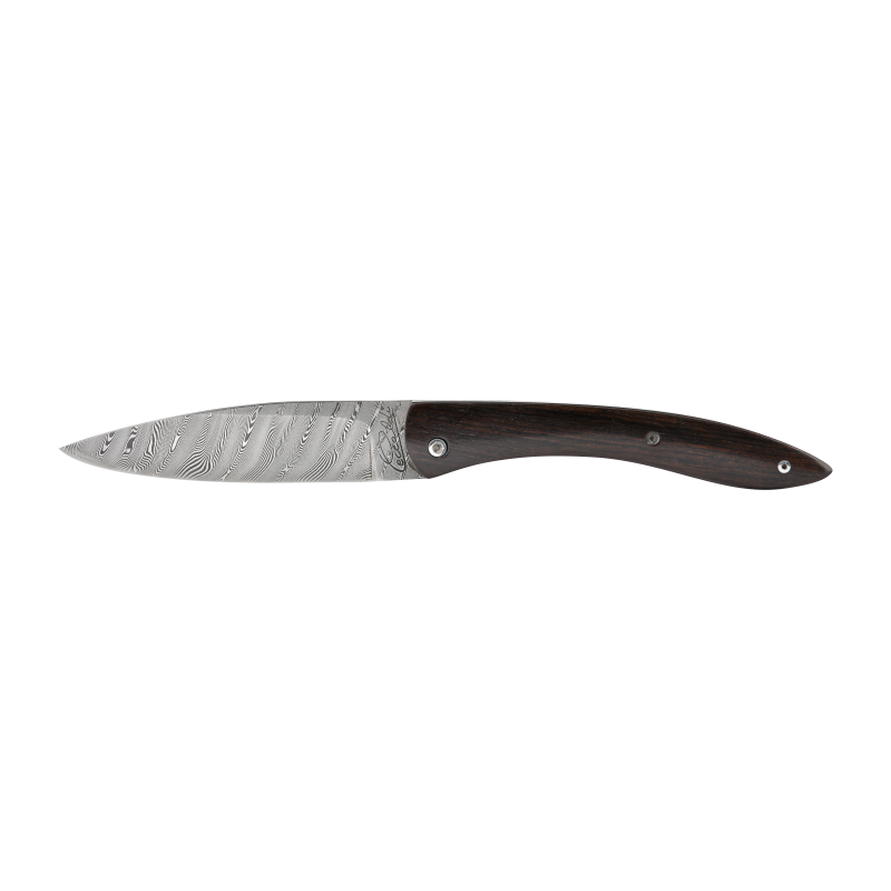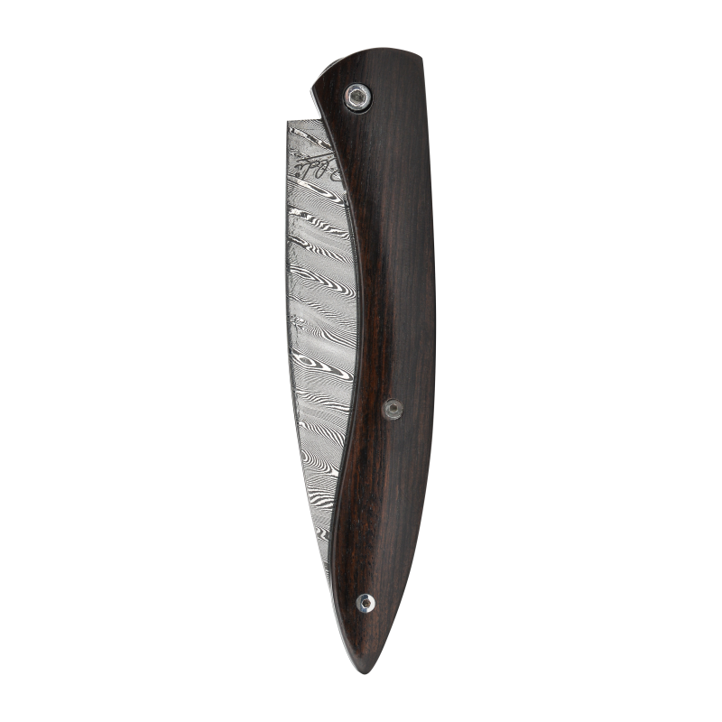 Le bois d'ébène utilisé par la maison Ceccaldi est sec et sain, il présente une couleur noire parfois veinée de marron clair, d'une densité importante, il se patinera peu avec le temps mais deviendra plus mat. Pour l'entretien du bois d'ébène il est impératif de ne pas plonger le manche dans l’eau. Il faudra également huiler ce manche, une à deux fois par an, avec de l’huile de camelia ou d'olive par exemple.