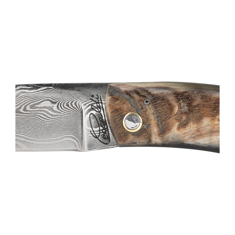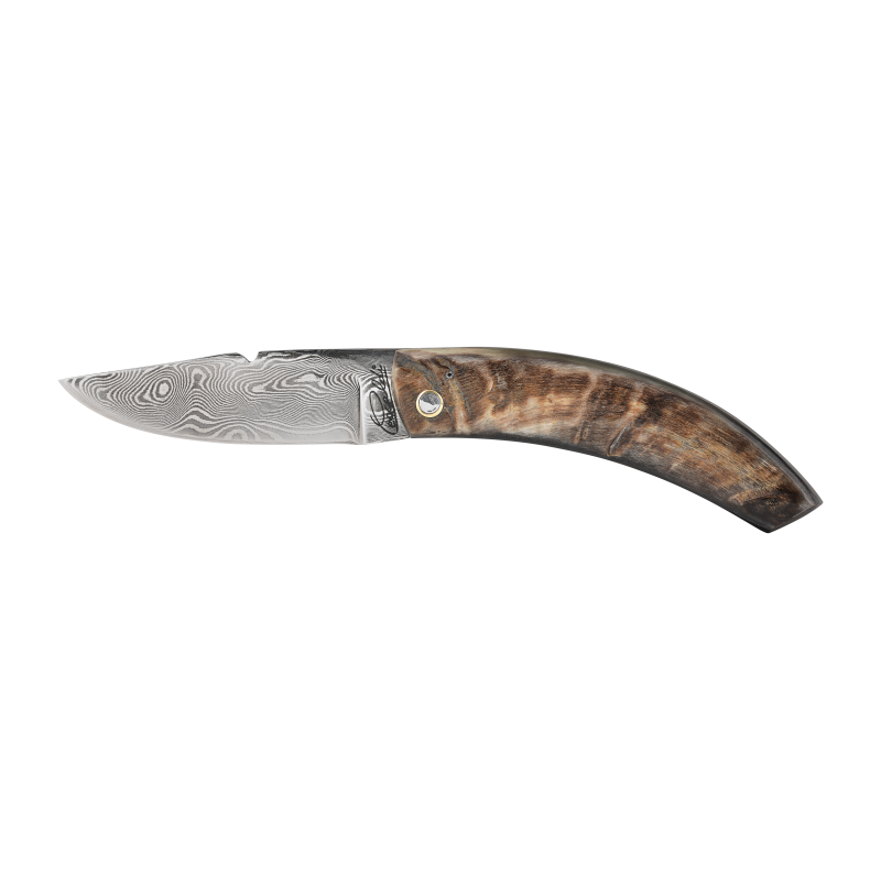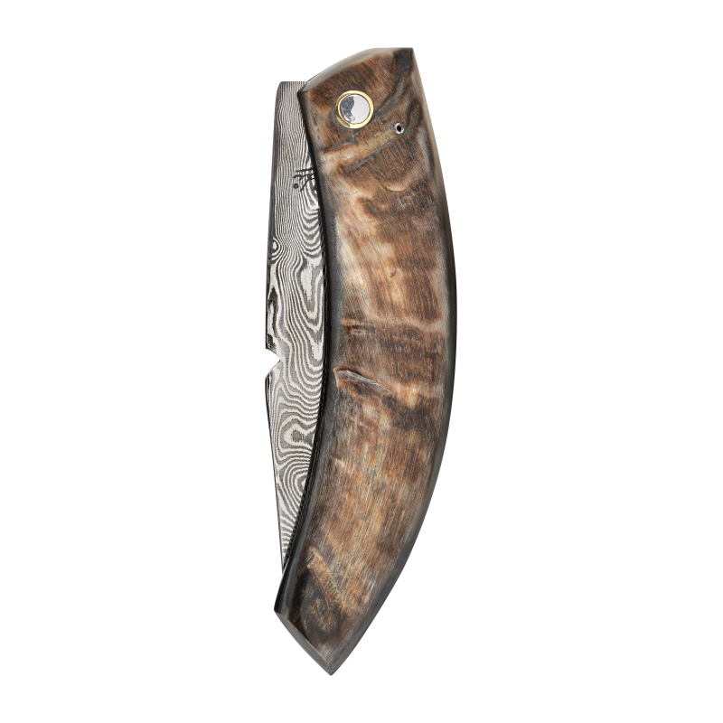 La corne de bélier est d'abord plongée dans un bain d'huile chaude avant d'être redressée dans un étau. Après cette étape cette corne est prête à être découpée pour épouser la forme des manches de nos couteaux. Il s'agit 'un matériau vivant, aux couleurs nuancées, du blond au noir profond, nous utilisons la partie extérieure de la corne, celle- présente donc des aspérités naturelles, ce qui renforce le caractère unique de ces manches. Pour l'entretien de cette corne il convient de ne jamais la plonger dans l'eau et de l'hydrater une à deux fois par an à l'aide d'huile d'olive ou de camélia.