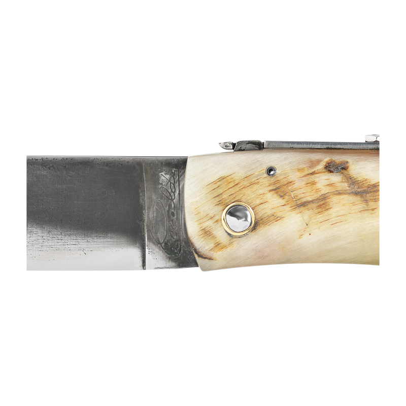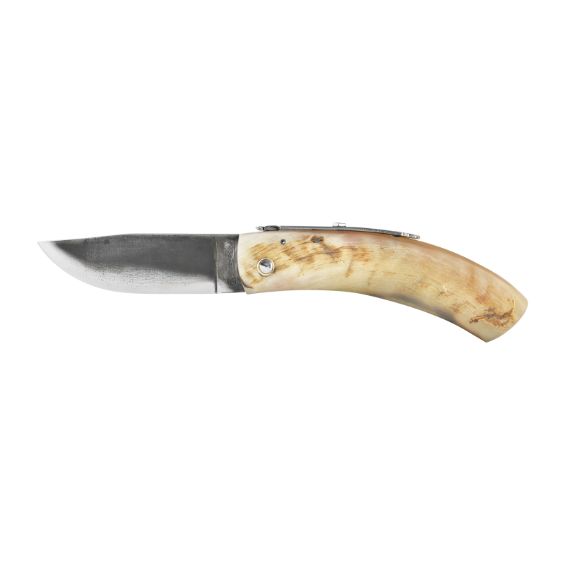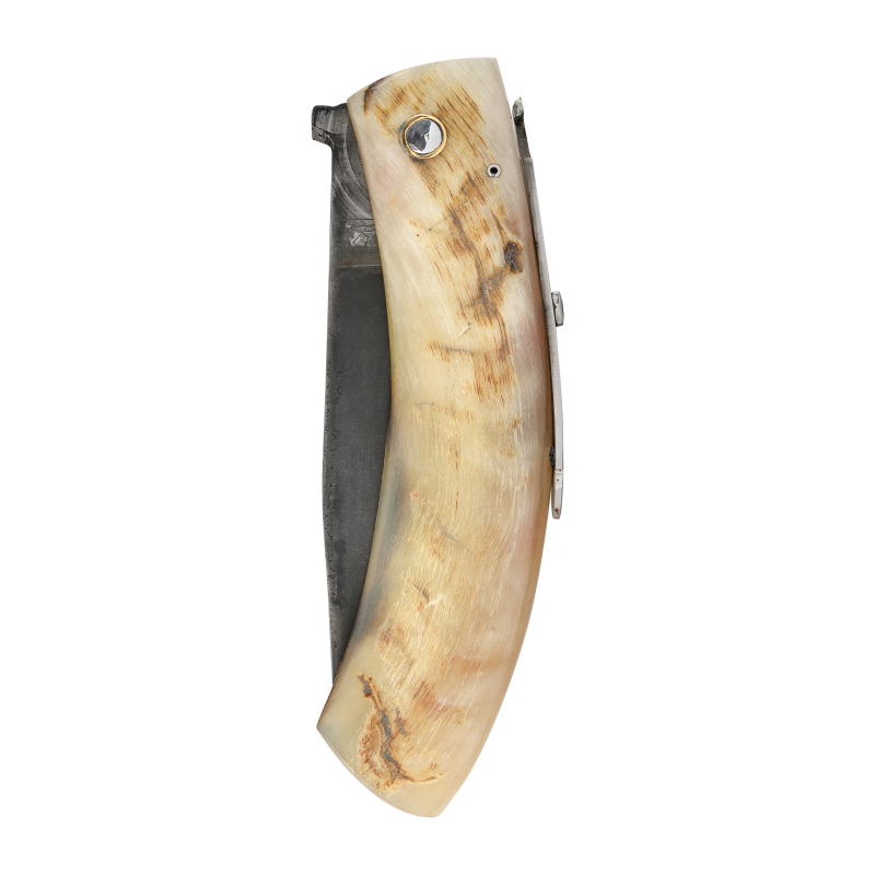 La corne de bélier est d'abord plongée dans un bain d'huile chaude avant d'être redressée dans un étau. Après cette étape cette corne est prête à être découpée pour épouser la forme des manches de nos couteaux. Il s'agit 'un matériau vivant, aux couleurs nuancées, du blond au noir profond, nous utilisons la partie extérieure de la corne, celle- présente donc des aspérités naturelles, ce qui renforce le caractère unique de ces manches. Pour l'entretien de cette corne il convient de ne jamais la plonger dans l'eau et de l'hydrater une à deux fois par an à l'aide d'huile d'olive ou de camélia.