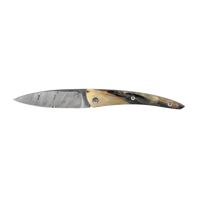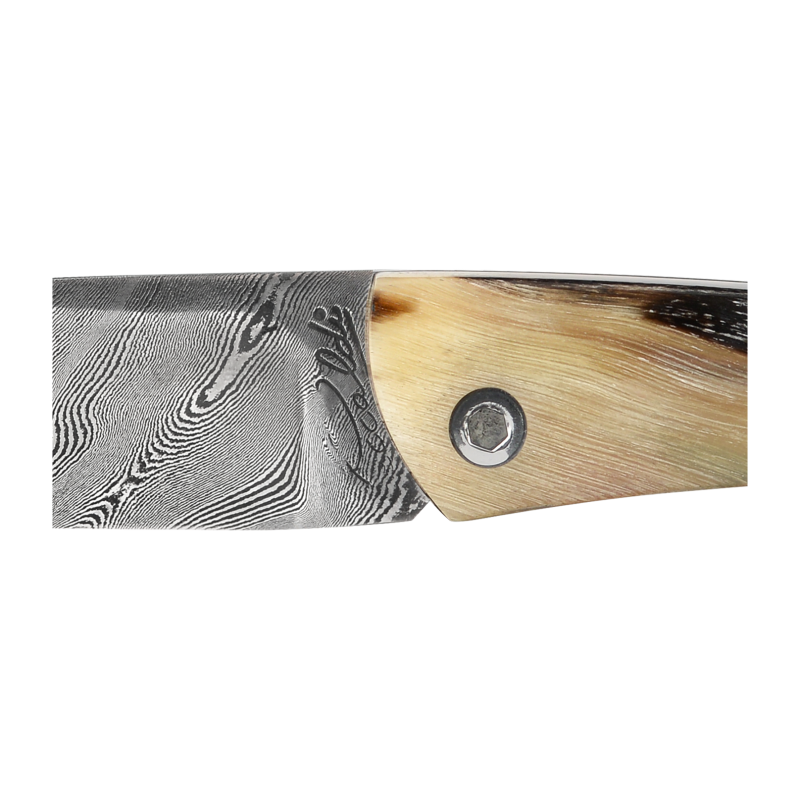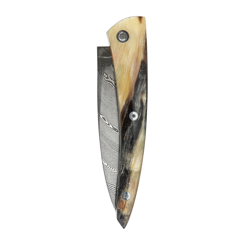 La corne de bélier est d'abord plongée dans un bain d'huile chaude avant d'être redressée dans un étau. Après cette étape cette corne est prête à être découpée pour épouser la forme des manches de nos couteaux. Il s'agit 'un matériau vivant, aux couleurs nuancées, du blond au noir profond, nous utilisons la partie extérieure de la corne, celle- présente donc des aspérités naturelles, ce qui renforce le caractère unique de ces manches. Pour l'entretien de cette corne il convient de ne jamais la plonger dans l'eau et de l'hydrater une à deux fois par an à l'aide d'huile d'olive ou de camélia.