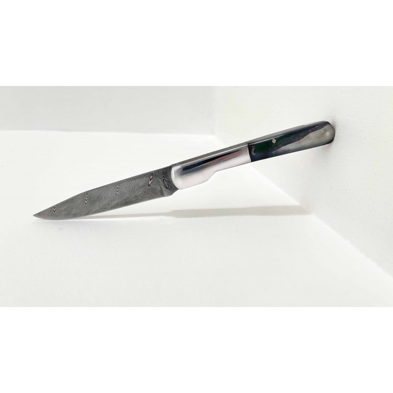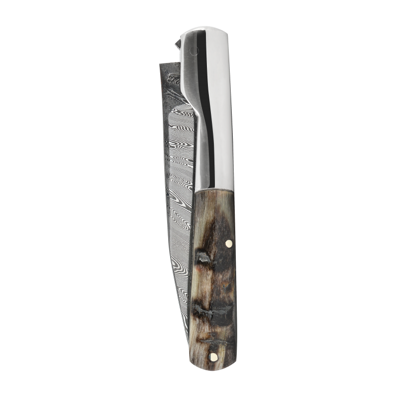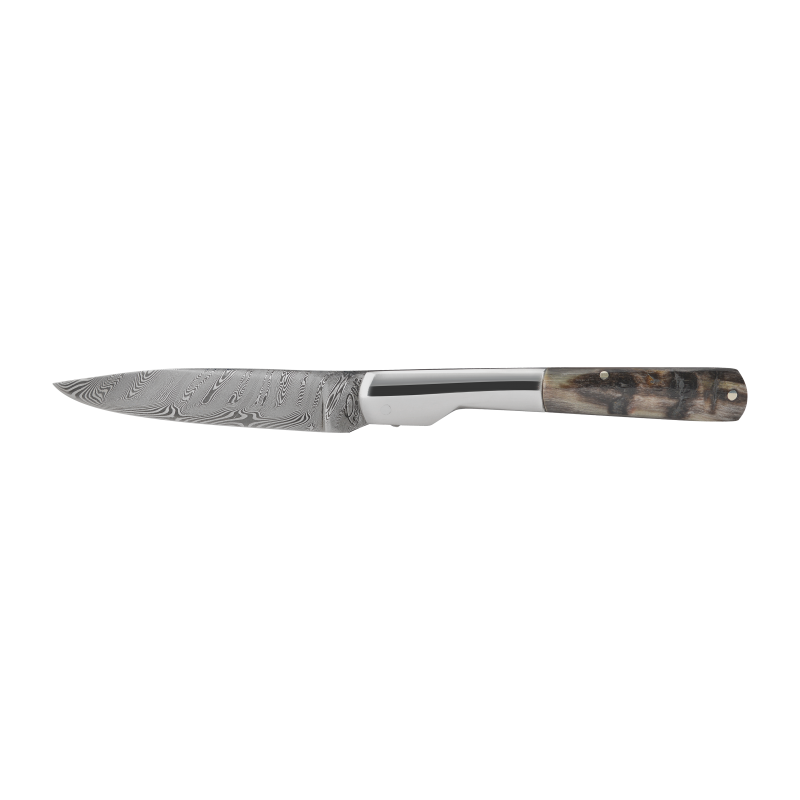 La corne de bélier est d'abord plongée dans un bain d'huile chaude avant d'être redressée dans un étau. Après cette étape cette corne est prête à être découpée pour épouser la forme des manches de nos couteaux. Il s'agit 'un matériau vivant, aux couleurs nuancées, du blond au noir profond, nous utilisons la partie extérieure de la corne, celle- présente donc des aspérités naturelles, ce qui renforce le caractère unique de ces manches. Pour l'entretien de cette corne il convient de ne jamais la plonger dans l'eau et de l'hydrater une à deux fois par an à l'aide d'huile d'olive ou de camélia.
